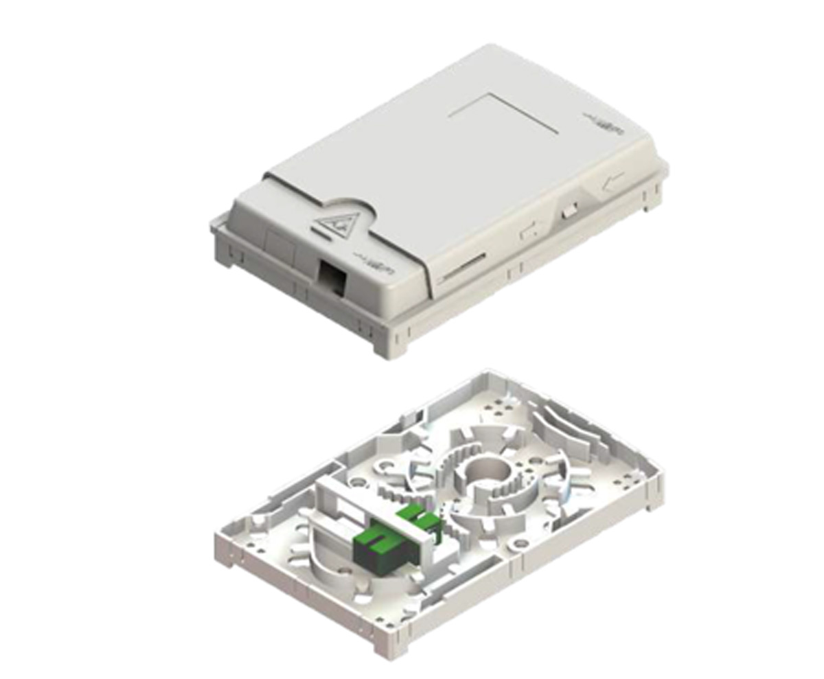 The NetSource Point of Entry (POE) Standard Enclosure is used for single-fiber terminations inside residential homes, offices, or apartments in fiber-to-the-home (FTTH) and fiber-to-the-premise (FTTP) applications. It is installed inside the building and does not serve as a transition point between outside plant (OSP) and inside plant (ISP) cabling. It is typically placed near the service entrance or an interior distribution location to support drop cable termination within customer premises. The enclosure supports two  SC connection and provides space for storing and routing fiber inside the unit. It accommodates splice and termination work between feeder and drop cables and includes designated locations for securing approved indoor cable types.