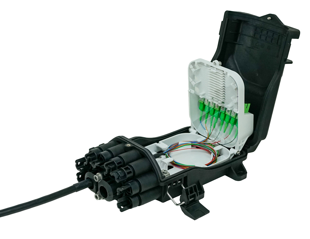 The Mini 8-Port Splice Terminal is a compact enclosure used for fiber distribution and splicing in broadband networks. It supports up to eight fiber connections and is suitable for indoor or outdoor use. The terminal is used for drop splicing, small distribution points, and repair work, providing a simple way to manage splices and terminations in tight locations.