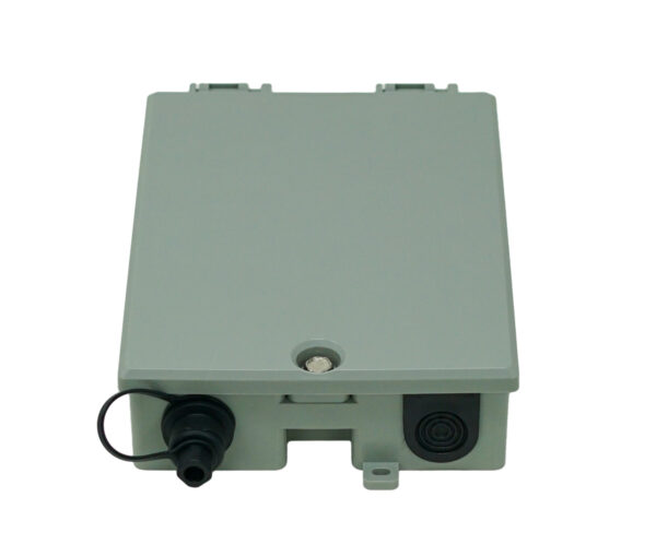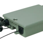 The enclosure includes grommeted cable entry ports that accommodate OptiTap® drops and round cables up to 5 mm outer diameter. The lid may remain partially open during installation or be fully removed.