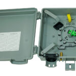 The NetSource SP-NID01-SPL is an outdoor enclosure used for single-fiber terminations at subscriber entry points in fiber-to-the-home (FTTH) and fiber-to-the-premise (FTTP) applications. It is used to transition between service provider feeder fibers and customer distribution fibers and may be mounted on a wall or pole. The enclosure accommodates flat drop cables, ROC cables, and round cables from 3 mm to 16.2 mm outer diameter and provides internal storage for up to 50 feet of fiber. It accepts one SC or two LC connections through designated cable entry locations and supports one optical fiber for splice-only configurations.