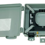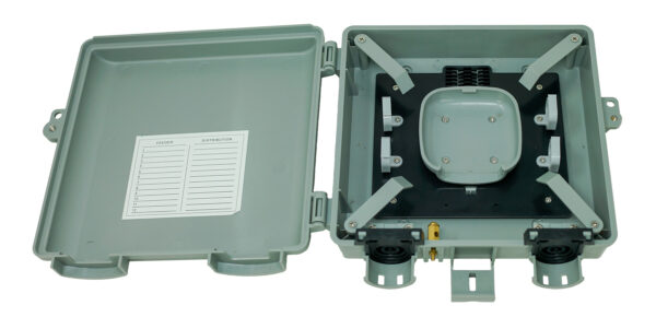 NetSource SP-NID01-ONU is an outdoor enclosure used at subscriber entry points for drop cable termination and transitions between service provider feeder fibers and customer distribution fibers in fiber-to-the-home (FTTH) and fiber-to-the-premise (FTTP) applications. It mounts to a wall or pole and is designed to house a Ubiquiti Optical Network Unit (ONU) as part of the network interface. The enclosure accommodates flat drop cables, ROC cables, and round cables from 3 mm to 16.2 mm outer diameter and provides internal storage for up to 50 feet of fiber. It includes designated cable entry locations and internal mounting features for securing the ONU within the enclosure.