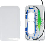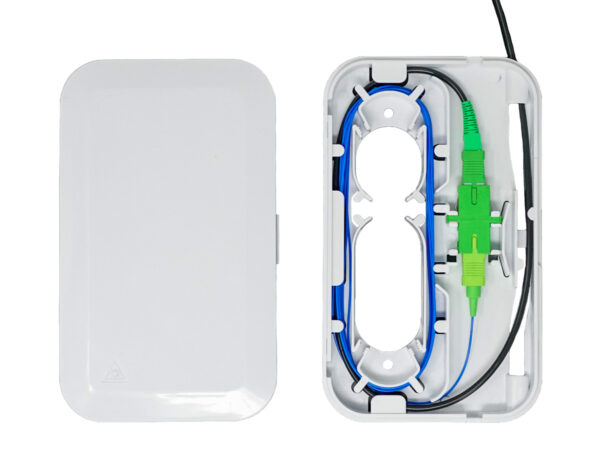 The enclosure supports one SC connection and provides space for storing and routing fiber inside the unit. It accommodates splice and termination work between feeder and drop cables and includes designated locations for securing approved indoor cable types.