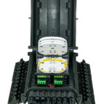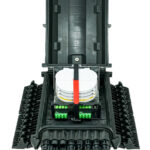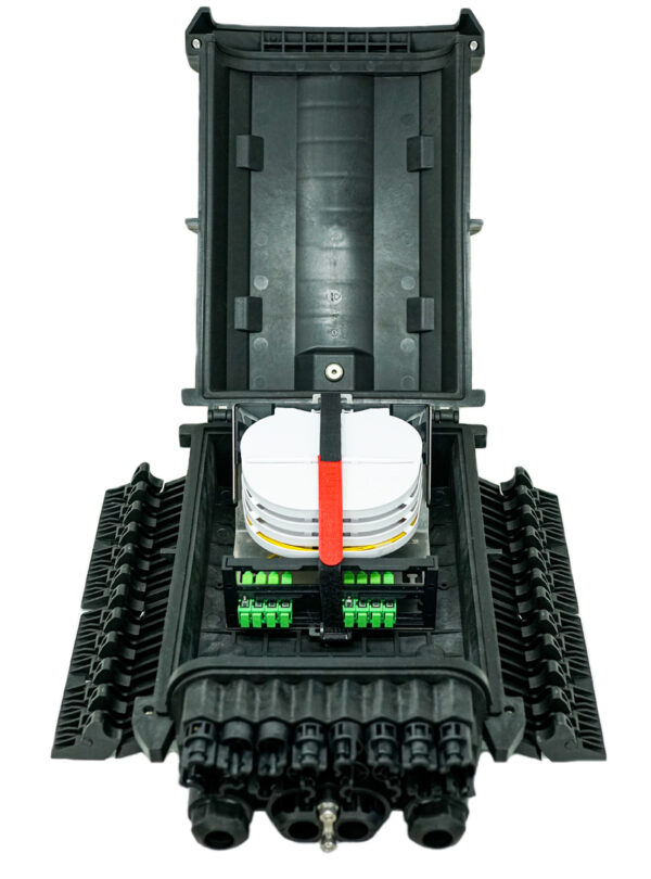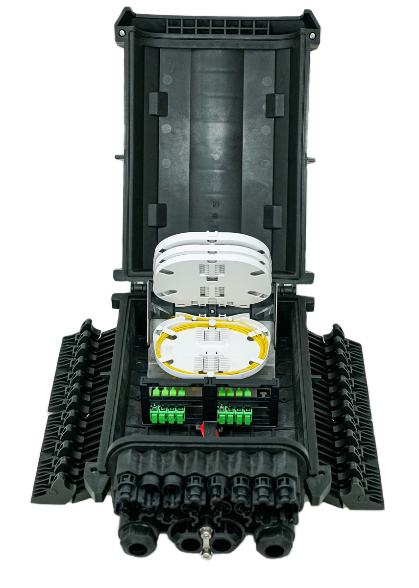 - Integrated stackable splice trays provide organized fiber management and support higher splice counts